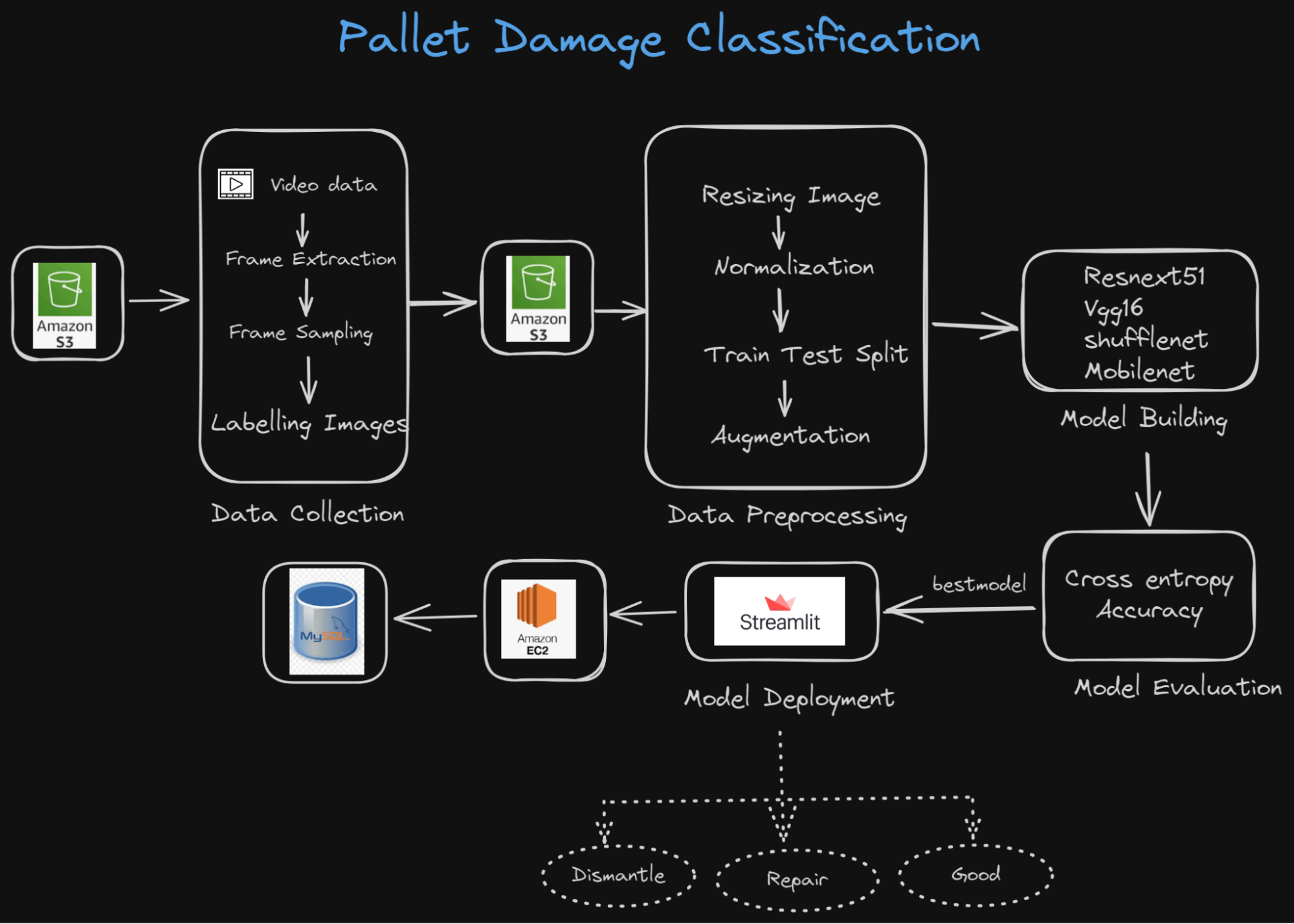 Problem Statement: To address the issue of unnoticed pallet damages and improve customer satisfaction, the client seeks to implement a sophisticated damage detection and classification system. Utilizing deep-learning models, the project aims to accurately classify wooden pallets into categories: good, repair, and dismantle. This technological solution intends to minimize manual inspection efforts, streamline inventory management, and ensure only quality pallets are delivered to customers.